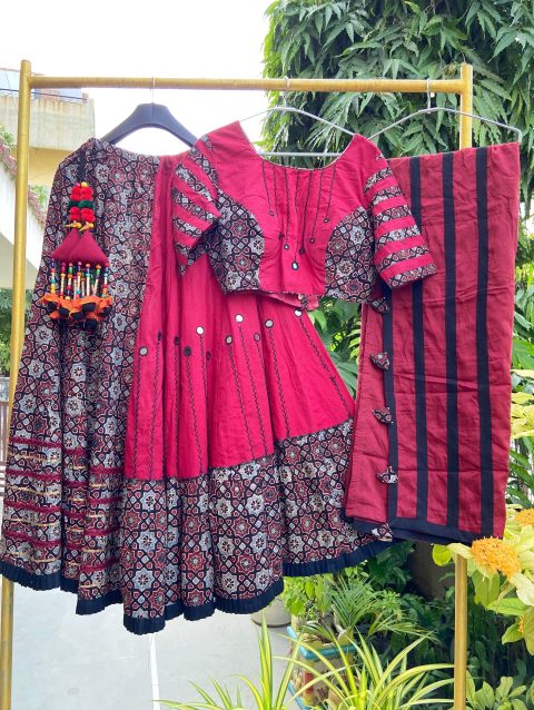 Cotton Ajrakh Chaniya with Hand work Half Plain & Half Printed with Plain Dupatta
