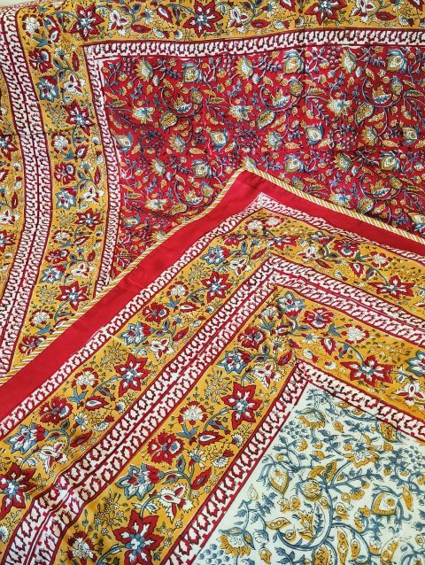 Cotton Mulmul single bed AC Dohar/Quilt. Available in standard and large sizes. Hand bock printed on fine cotton mulmul. These quilts are lined with cotton falalin fabric to provide just the right warmth for use in AC room.