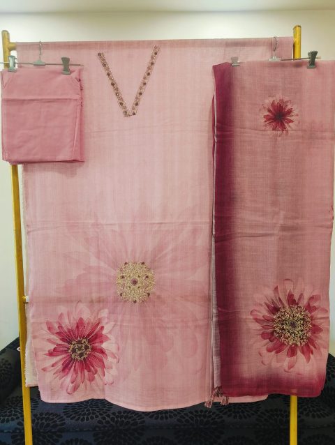 Green soft printed Linen fabric with neckline and Daman Handwork