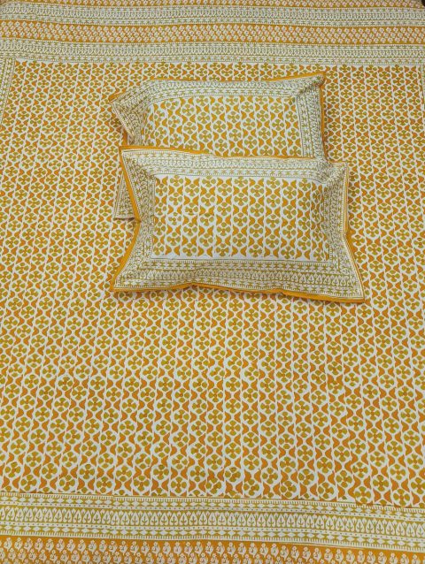 Yellow Handblock Printed Bedsheet with Pillow Covers